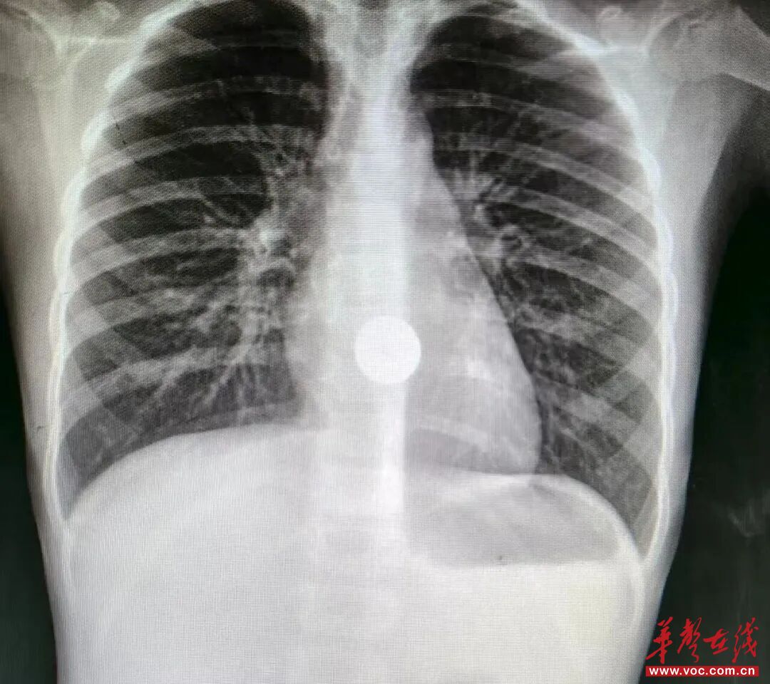 检查X光片清晰地显示:一枚圆形金属异物正卡在朵朵的食管上段,紧邻气管入口。时间一分一秒过去,朵朵吞咽困难、流口水、胸口疼痛的症状越来越明显。消化内科副主任、主任医师谭智迅速做出判断:硬币位置危险,必须尽快取出。
