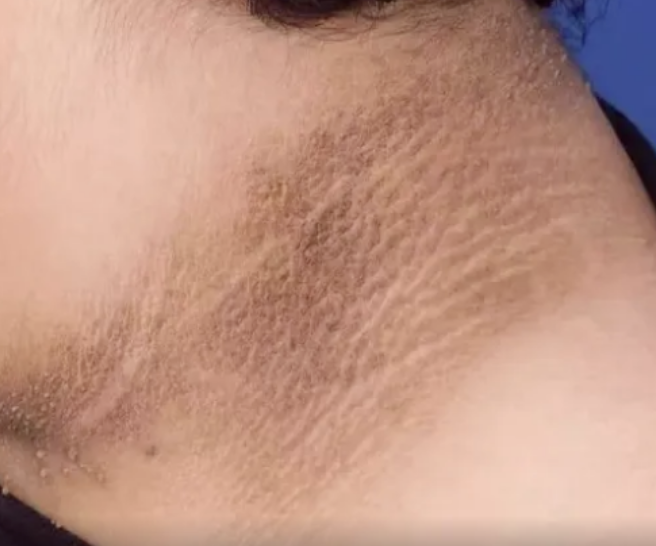 表现为皮肤皱褶处(尤其是颈部、腋窝、腹股沟)出现天鹅绒样的、增厚的、色素沉着加深的斑块。这是胰岛素抵抗(常见于肥胖,尤其是向心性肥胖)的经典皮肤标志,通常与糖尿病前期或2型糖尿病相关。皮肤摩擦也可能加重此情况。