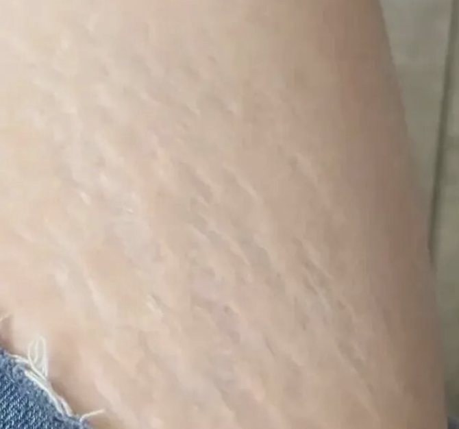 由于体重迅速增加或皮下脂肪组织过度扩张,导致真皮弹力纤维断裂。表现为身体脂肪堆积部位(如腹部、乳房、臀部、大腿、上臂)出现的红色、紫色或粉红色的条纹状皮损。随时间推移,颜色会变淡,变成白色或银白色的萎缩性条纹。虽然常见于青春期生长、妊娠期,但肥胖是重要诱因。
