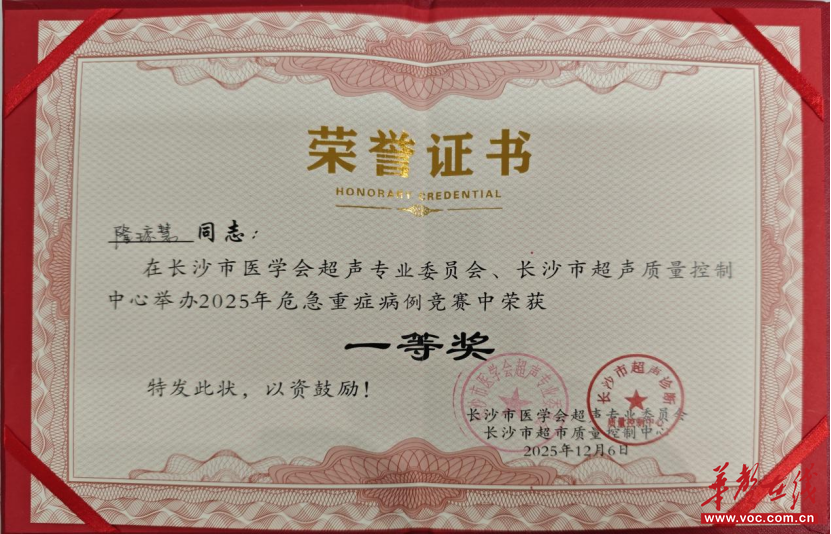 华声在线12月9日讯(通讯员 隆琼慧 任柳琼)近日,在由长沙市医学会超声专委会、长沙市超声质控中心主办的“危急重症与临床新进展研讨班”的病例竞赛中,长沙市第四医院超声科副主任医师隆琼慧凭借《十二指肠穿孔的精准诊断》病例,以扎实的专业功底、清晰的逻辑和生动的解读脱颖而出,荣获一等奖,充分展示了医院在危急重症超声诊断领域的专业实力。