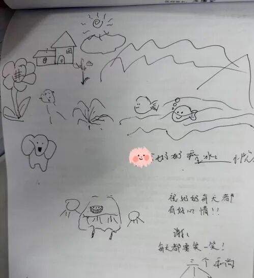 经过一段时间系统规范的康复治疗,王奶奶的状态日渐向好:情绪愈发平和,愿意主动与医护人员交流、分享日常,脸上的笑容也越来越多。从起初沉默少语,到如今眉眼带笑,老人的变化清晰可见。闲暇时,她还会用画画的方式与医务人员互动。充满温情的文字和画面非常治愈。