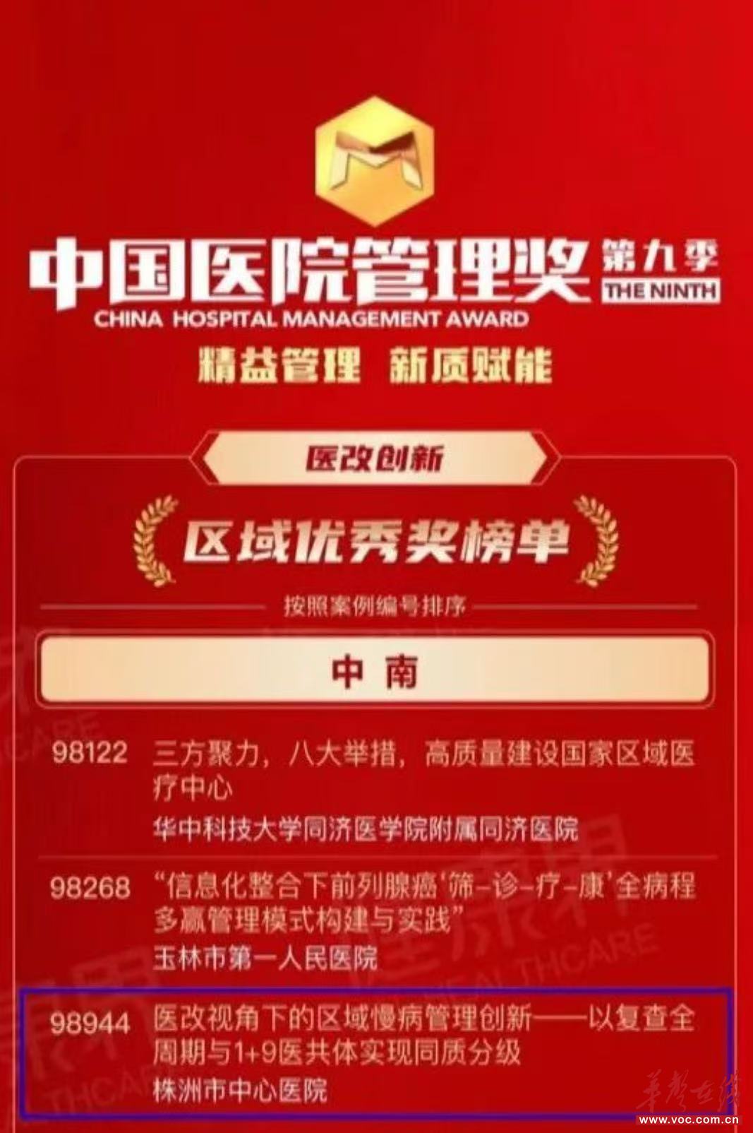 华声在线9月23日讯(通讯员 杨靓)近日,株洲市中心医院在第九届“中国医院管理奖”医改创新主题中,凭借《医改视角下的区域慢病管理创新——以复查全周期与1+9医共体实现同质分级》案例,在全国27个省(自治区、直辖市)442家医疗机构申报的2410个案例中脱颖而出,成功斩获医改创新主题区域优秀奖,成为湖南省该主题唯一获此殊荣的医疗机构。