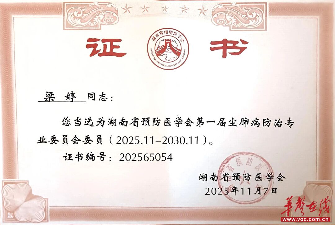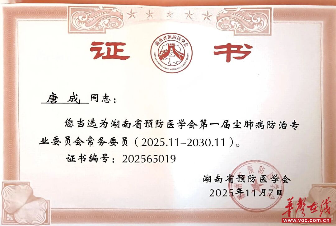 此次大会上,医院呼吸与危重症医学科主任唐成当选湖南省预防医学会第一届尘肺病防治专业委员会常务委员,副主任彭颖,副主任医师王琼、梁婷当选委员。这支精锐团队,正是医院尘肺病防治工作的中流砥柱。他们以精湛的医术、深厚的学识,推动技术创新与学术交流,为全省职业健康事业注入蓬勃活力。