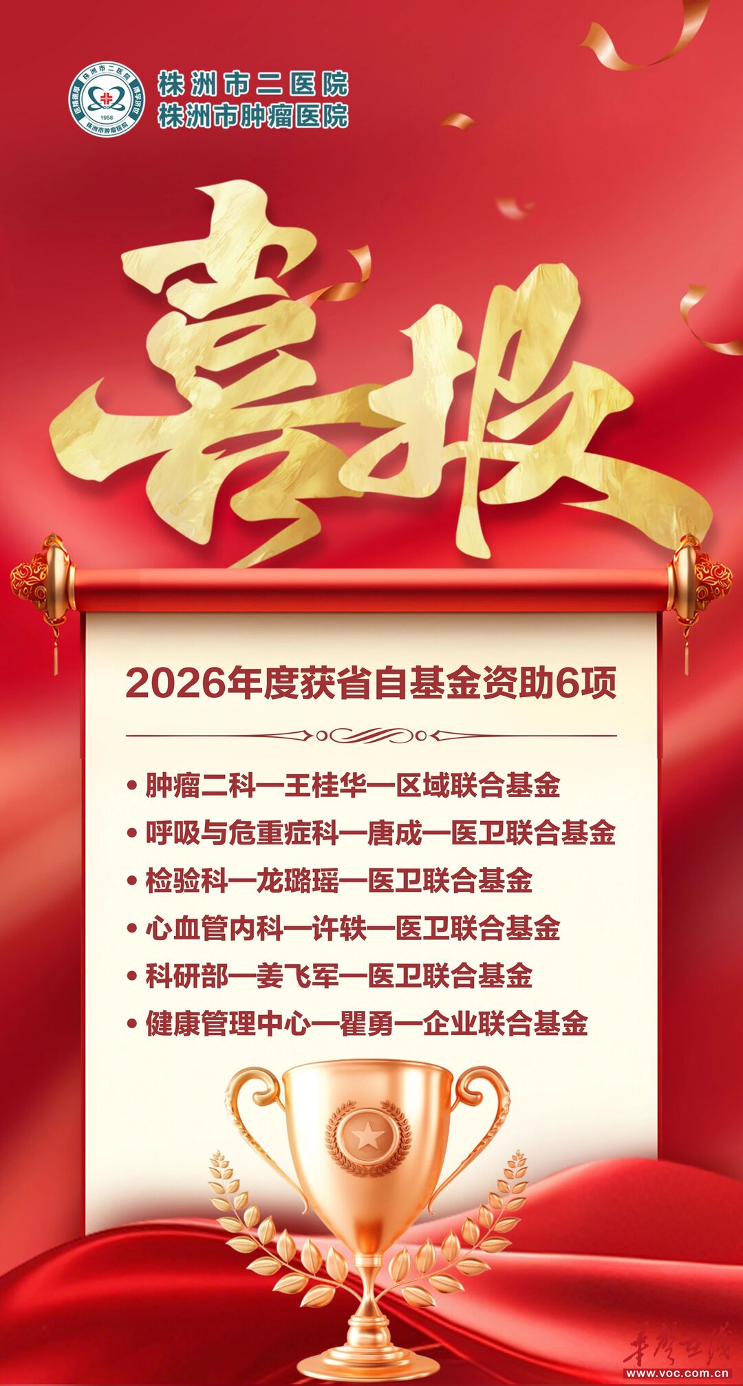 华声在线12月28日讯(通讯员 陈恺祺)12月26日,湖南省科学技术厅正式公布2026年度湖南省自然科学基金拟立项名单。株洲市二医院凭借扎实的科研积累与卓越的申报质量,一举获得6项立项资助,不仅实现了立项数量的历史性突破,更以“一项区域联合、四项医卫联合、一项企业联合”的多元布局,展现出医院在基础研究与协同创新领域的深度融合与强劲动能。
