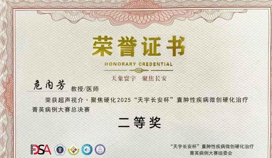 华声在线1月27日讯(通讯员 危内芳)近日,在西安落幕的“天宇杯”囊肿硬化性疾病全国总决赛传来捷报。长沙市第四医院超声诊断科青年医师危内芳历经全国病例初筛、多轮预赛与区域选拔的激烈角逐,最终凭借精湛的诊疗技术与优异的临场发挥,在总决赛中脱颖而出,荣获全国二等奖。